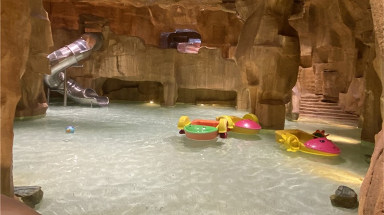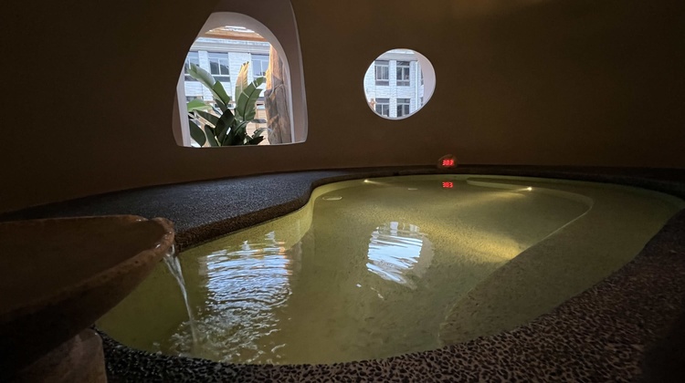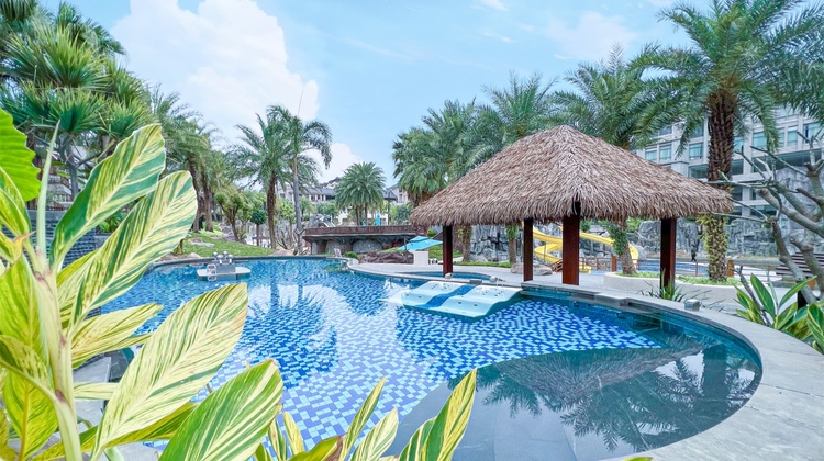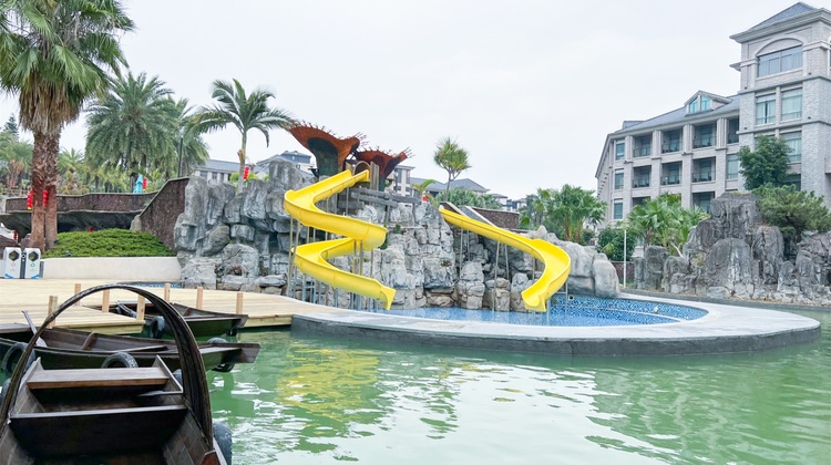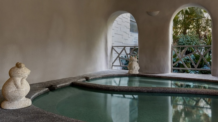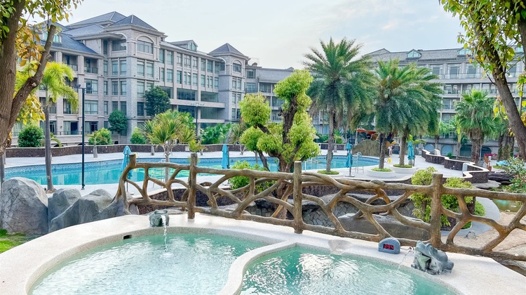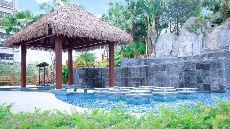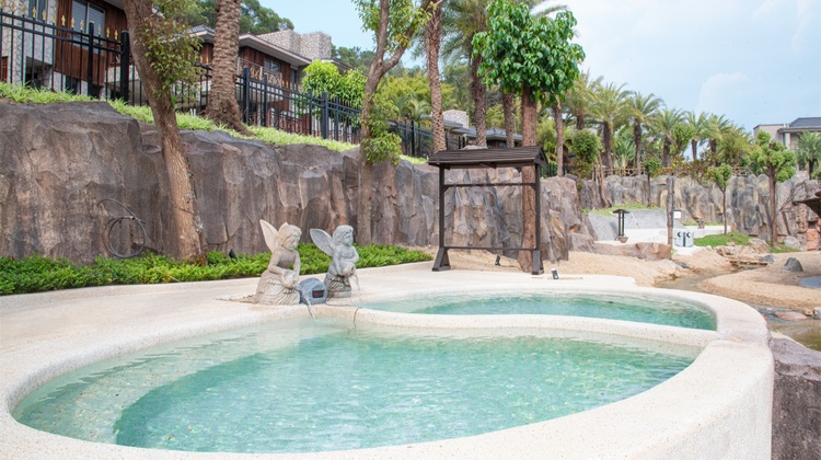 汤池巧妙地镶嵌于葱郁的绿意之间
