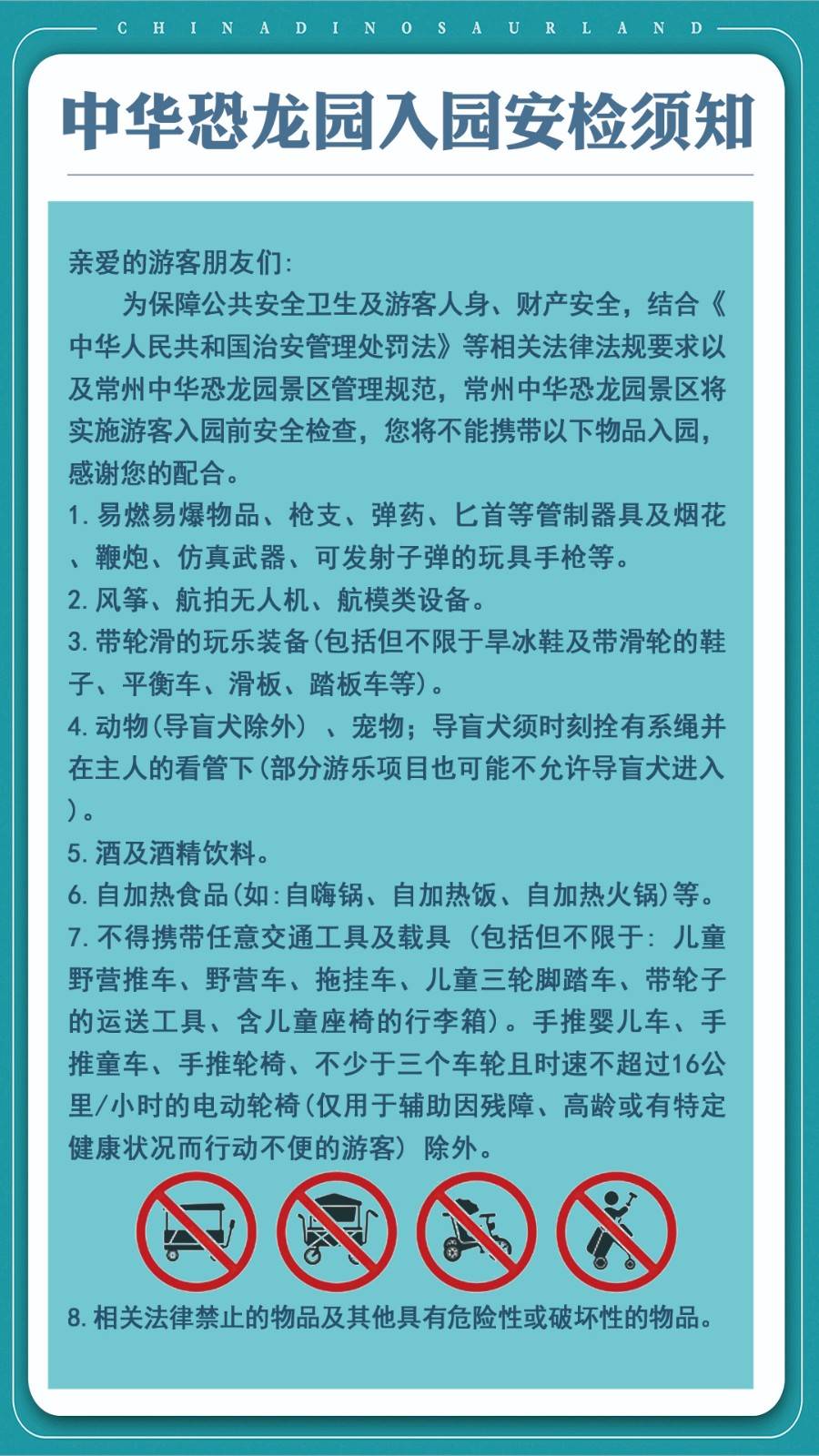 为保障公共安全卫生及游客人身、财产安全,结合《中华人民共和国治安管理处罚法》等相关法律法规要求以及常州中华恐龙园景区管理规范,常州中华恐龙园景区将实施游客入园前安全检查,您将不能携带以下物品入园,感射您的配合。