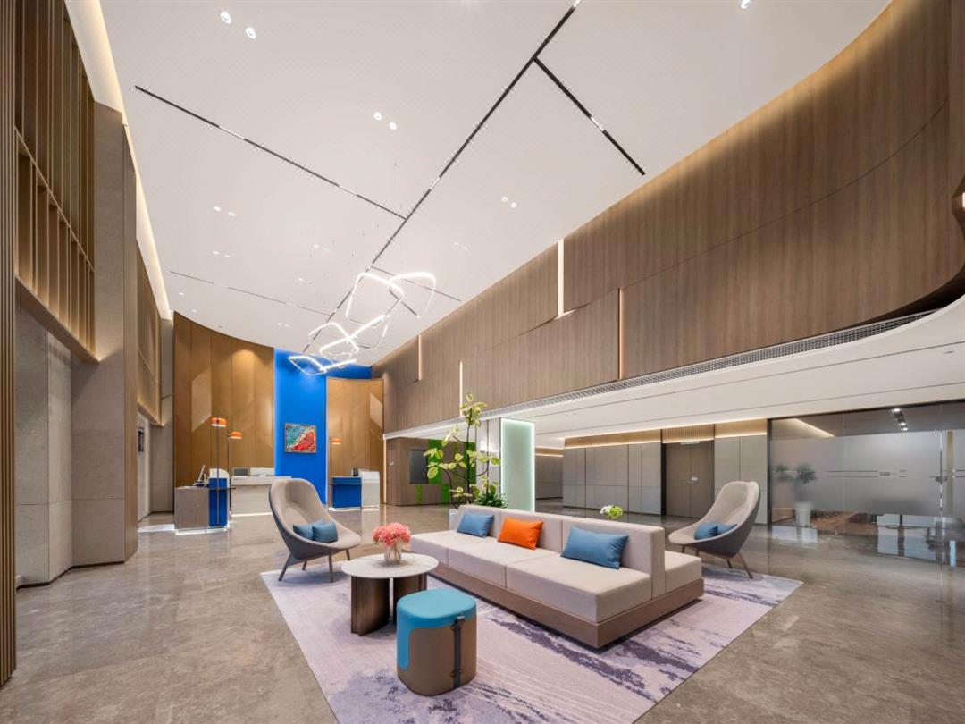 踏入酒店大堂,明亮开阔的空间瞬间映入眼帘。高挑的天花板搭配造型独特的吊灯,大胆的橙蓝配色,营造出时尚活泼的氛围。大堂地面采用高品质的大理石铺设,其细腻的纹理与光洁的表面,不仅彰显出大气,还与整体环境相得益彰。
