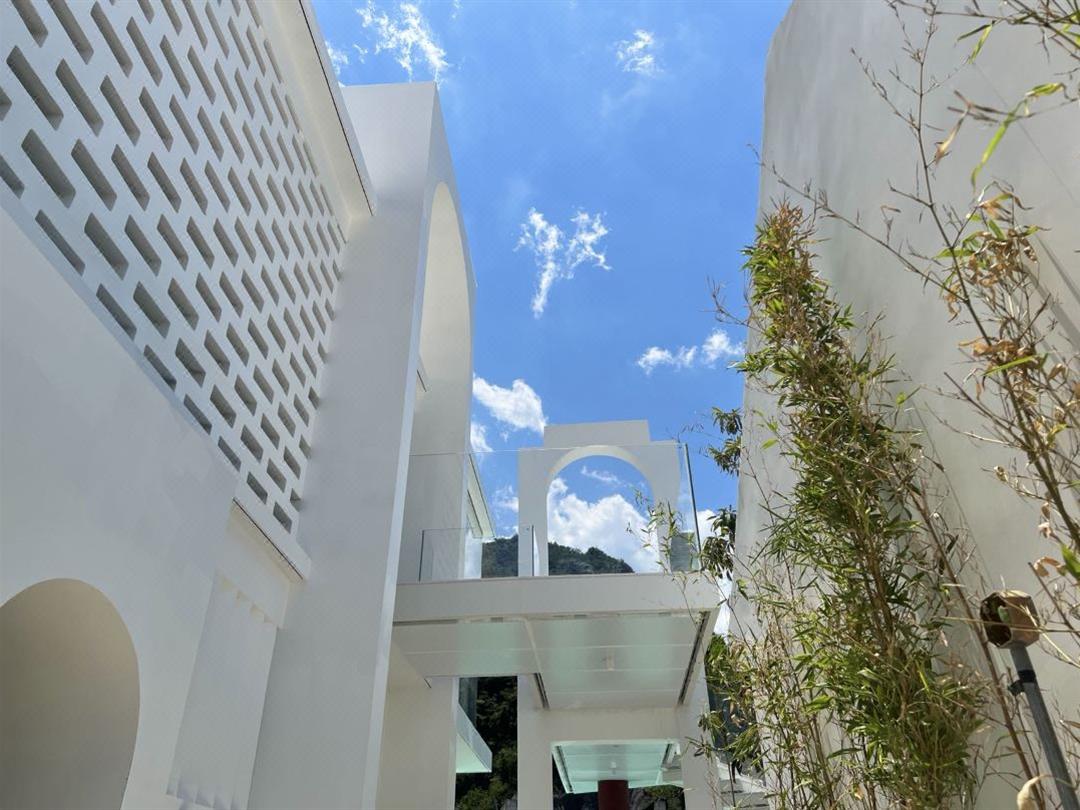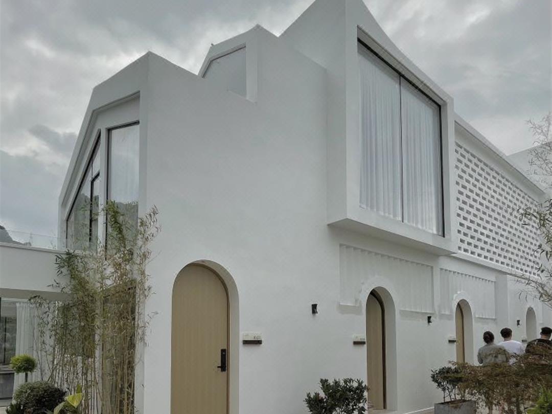 民宿主体是一幢白色的二层小楼,斜坡屋顶,大量的拱形门,设计感满满,让人瞬间穿越到希腊圣托里尼。