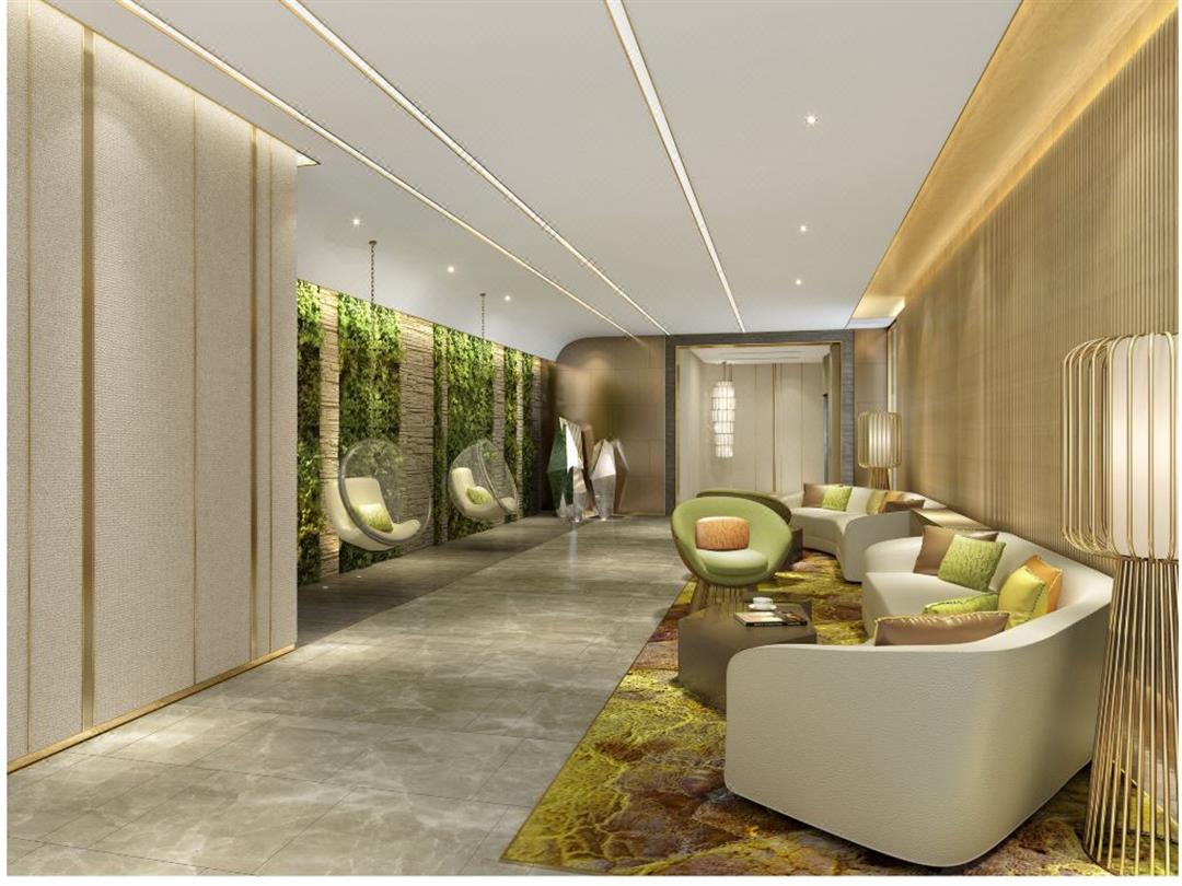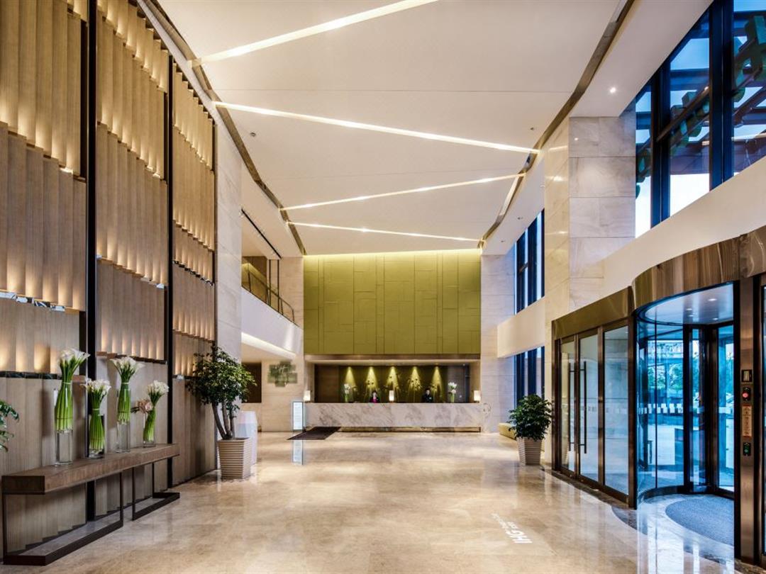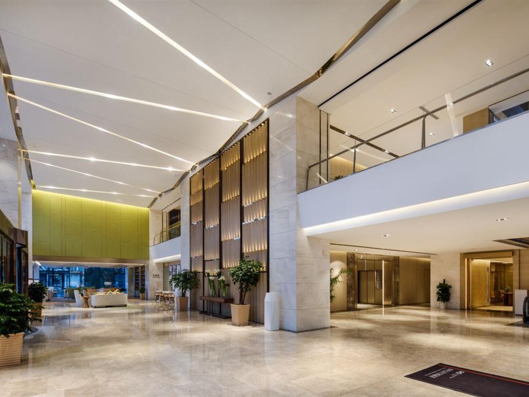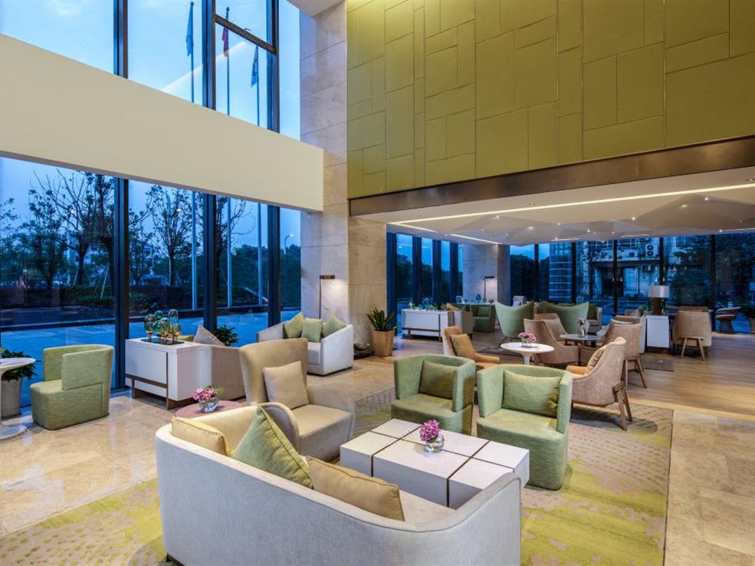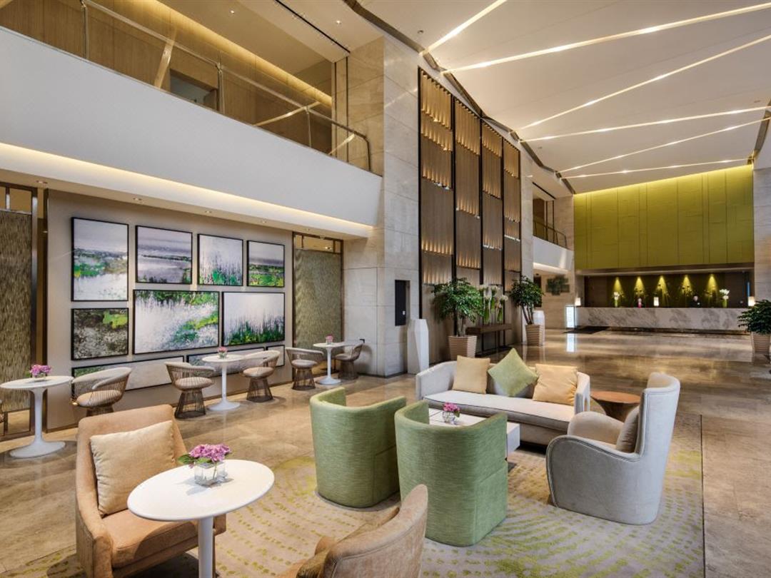 酒店大堂的设计灵感结合长江的周边景观特色,明快的亮黄、清新的翠绿、附以素雅灰白,简约又不失活力。