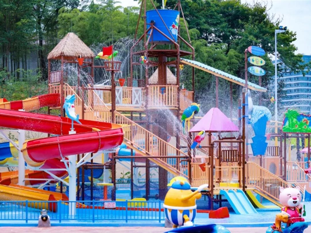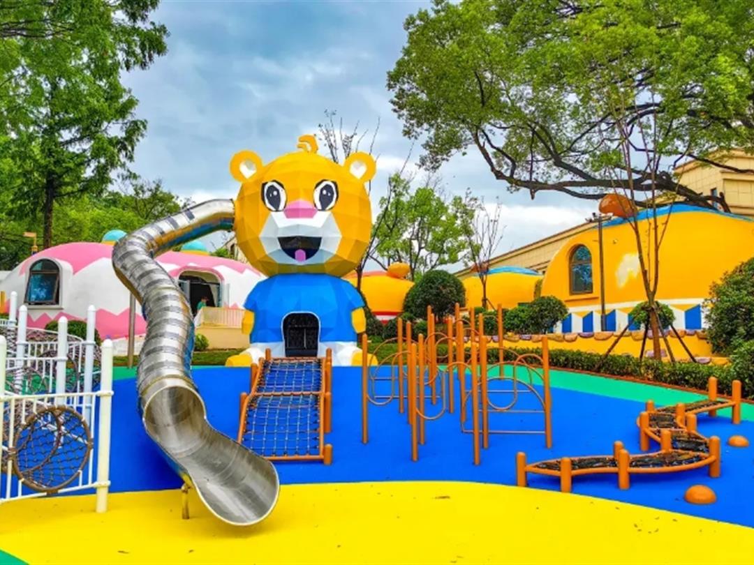五颜六色的色块中,有滑滑梯、旋转圆盘、蹦蹦床、跷跷板,四周遍布萌萌的客房,像置身童话世界。