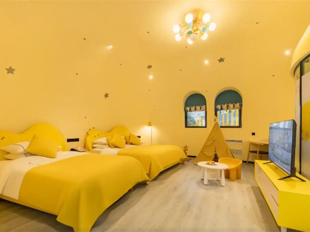 萌熊大本营,有15间豪华双床木屋+豪华双床副楼庭院,主色调为黄色,以萌熊集合的营地概念,组合打造的大本营。