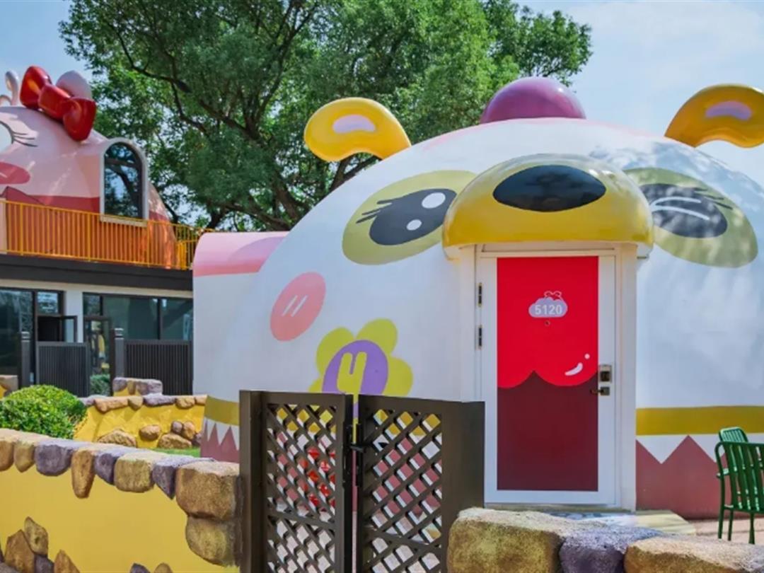大熊趣学院,有10间豪华大床主题木屋,以校园场景,打造的粉色主题分区。
