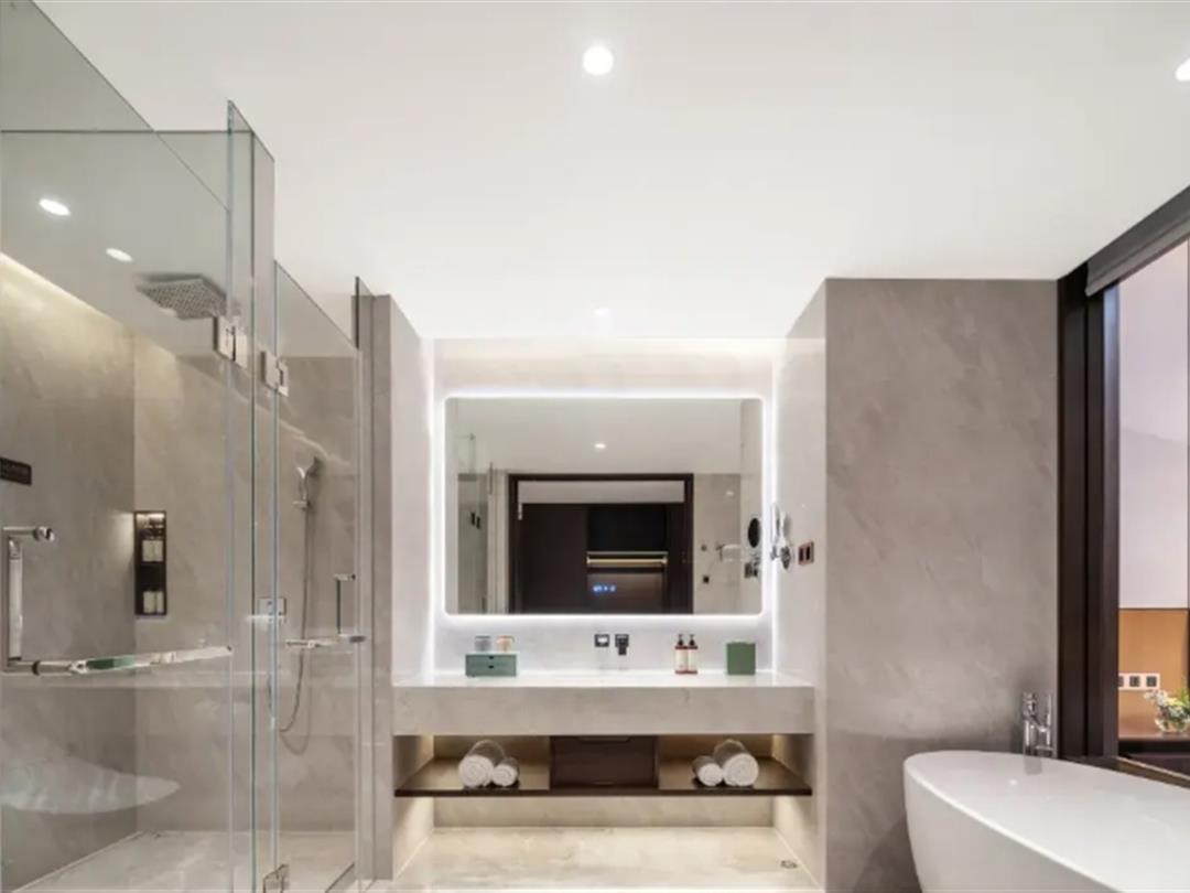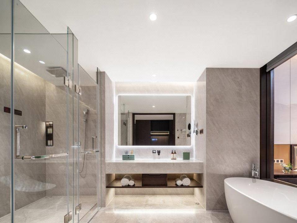 客房配置上则是现代智能化,电动窗帘、智能马桶(大床房配有TOTO浴缸)等一应俱全,干湿分离的卫浴间还有美国知名护肤品牌裴礼康°(Perricone MD)全套洗漱备品。