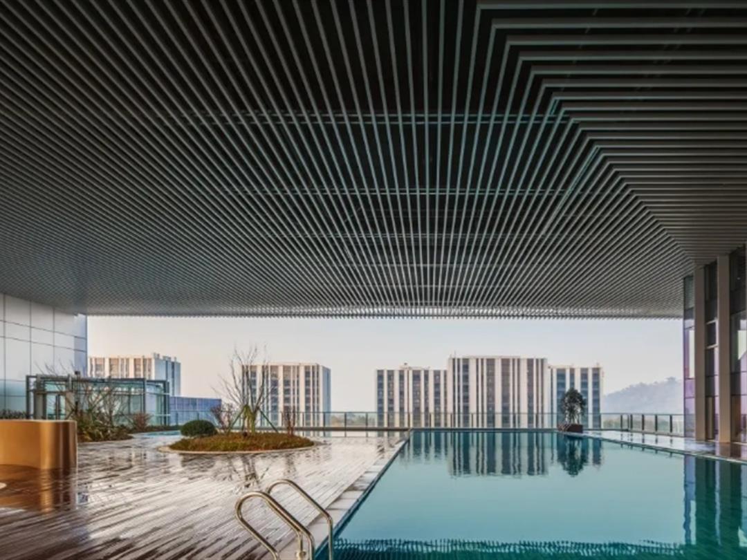 走进大堂,蓝金沙地面在灯光照耀下,大面积的流动纹理,显得格外大气;镂空金属屏风隔断,营造出独特新中式灵动质感;四周细木栅格窗代替现代化的玻璃窗,中央上方借鉴了古镇徽派建筑风格,独特的江南水乡韵味油然而生。