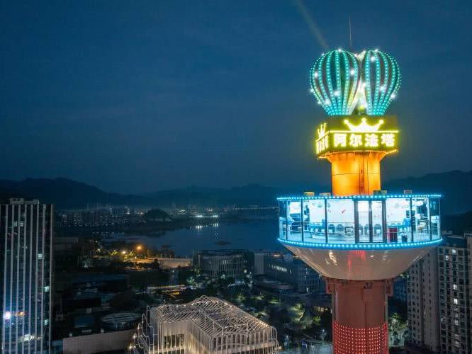约262英尺高的阿尔法塔,以“黑科技”打造360°全景玻璃观景台,登顶可俯瞰千岛湖星罗棋布的岛屿与碧波,夜晚更有沉浸式光影秀点亮天际线。