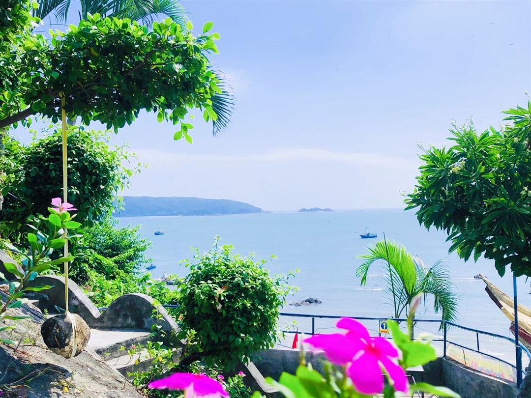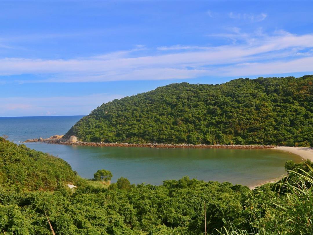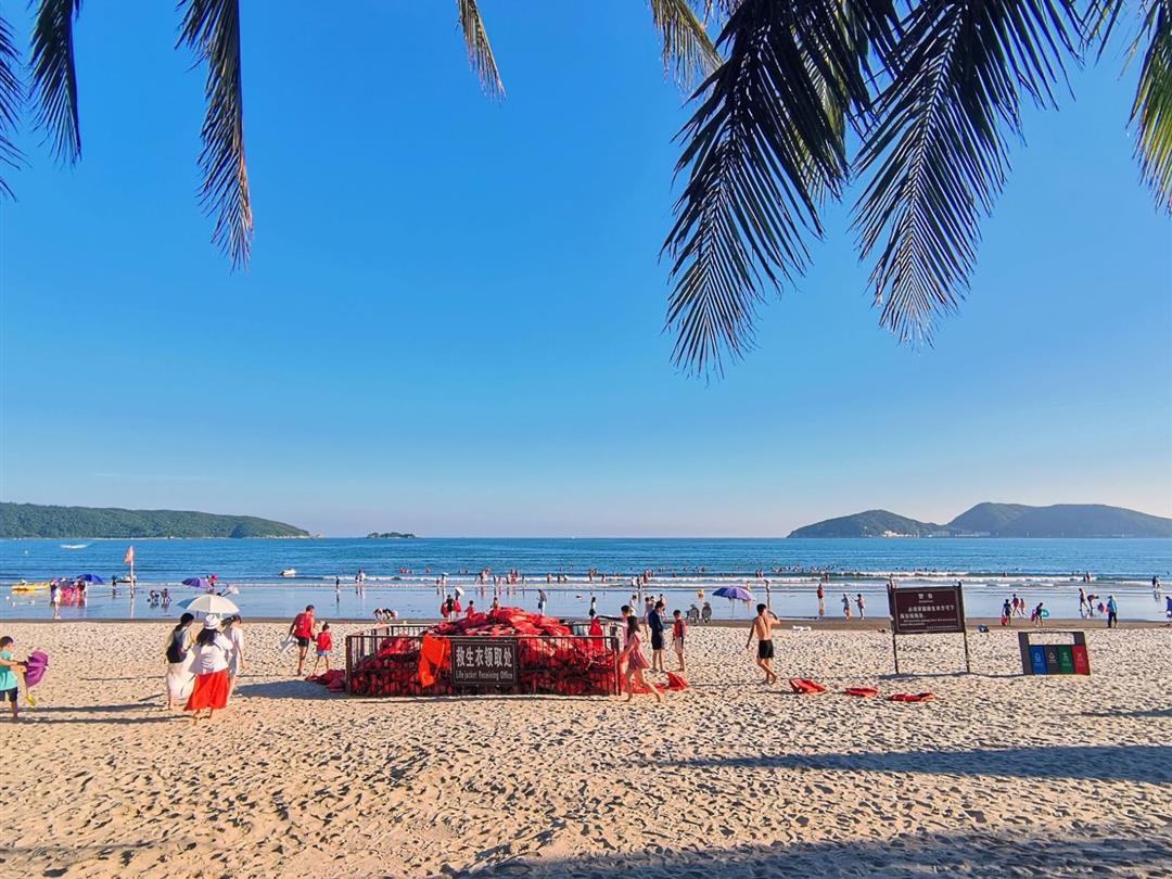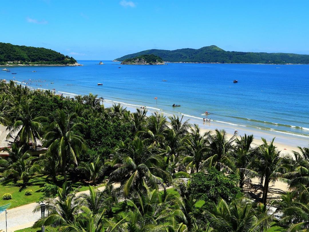 从码头下船上岛后需乘坐接驳车前往景区,海边绵延有千余米长的椰林,吹着海风,漫步在椰林下,别有一番滋味。也可以攀上登高石去看看海里的“七星伴月”,这是由七个大小不一,形态各异的小岛组成,七个小岛在海雾中若隐若现,与优美的大湾相映成趣。
