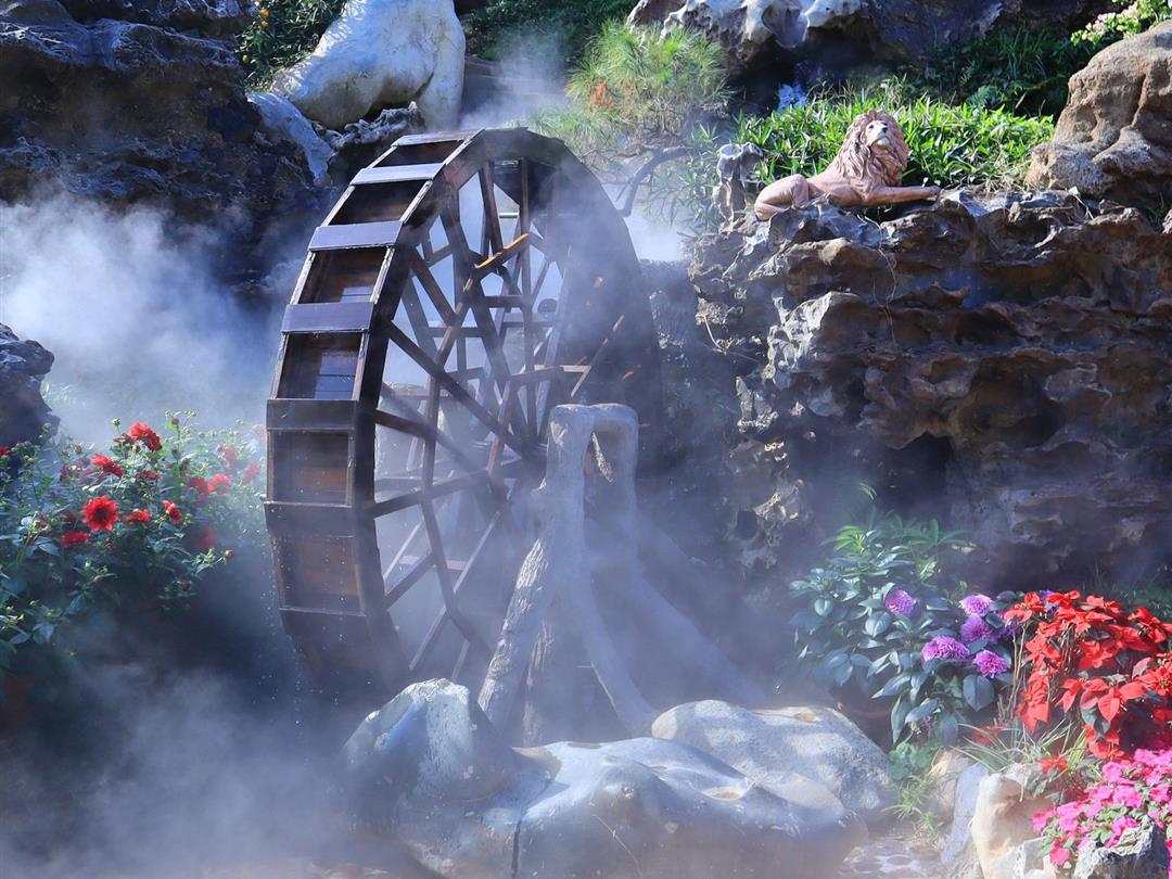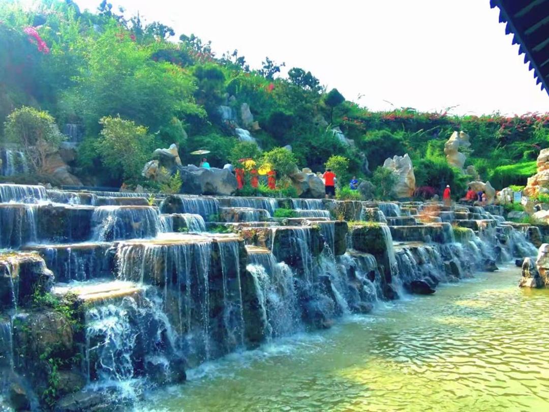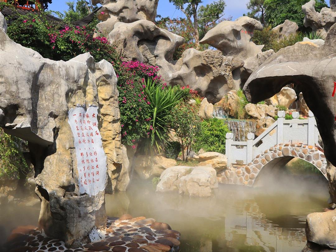 岭南凤凰园位于广东省茂名市高州市宝光街道茶亭木兰大道中,占地300余亩,呈现出独具杨氏风格的江南园林之景观。岭南凤凰园依山傍水,把“叠山、理水、建筑、绿化”作为建园的四要素,其中“叠山”就是用太湖石叠砌成各式各样的假山堆砌自然,奇石有趣,群瀑飞溅,溪水从山上悬岩石缝流出,形成宽阔的瀑布群流入湖中,烟雾缭绕。江南园林甲天下,凤凰园林甲江南。这是杨幸注的美好夙愿。整个园林满布珍贵的太湖石,几十吨乃至一百多吨,高7米以上,宽5米多的奇形怪状的太湖石就有一百多块,能独立成景的有数百块。这些玲珑剔透的太湖石,奇形怪状,千姿百态,浑穆古朴,凝重深沉,超凡脱俗,独立成峰的孤石,并列成林的景观,巧作构思,有像凤凰展翅,有的似猛虎啸山,有如骏马腾飞,有若鸳鸯戏水,有如金鸡报喜,有象征一帆风顺、聚财进宝等,栩栩如生。同时,园林遍种名树,奇花异草,绿树成荫,曲径通幽,溶洞花巷,引人入胜,尽显绿杨特色,实为炎炎夏日避暑胜地。