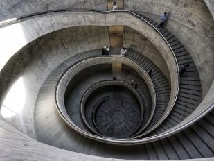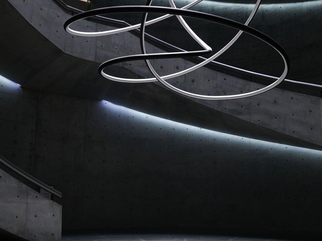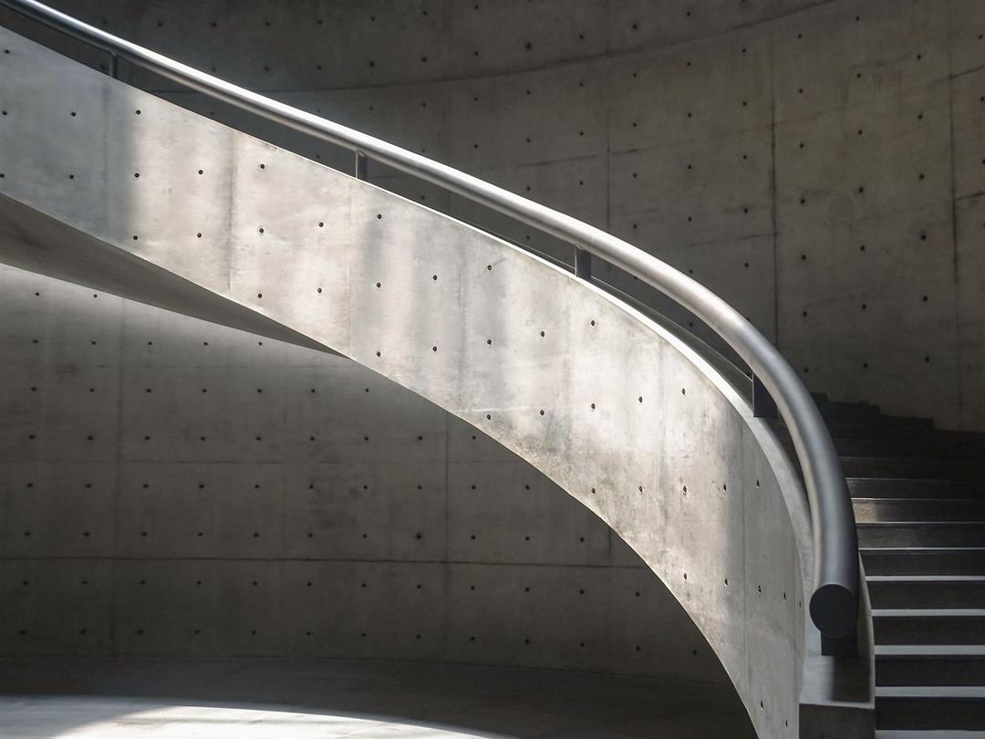 建筑从细部到整体构成,甚至包括景观设计,都如同水面的波纹一样,层层展开。而中心便是圆筒状5层挑空的空间。双重螺旋楼梯盘旋而下,形成中央圆形空间。如同DNA结构的双螺旋清水混凝土楼梯,是HEM建筑一个令人叹为观止的亮点,同时也见证了中国建筑技术的飞跃进步。