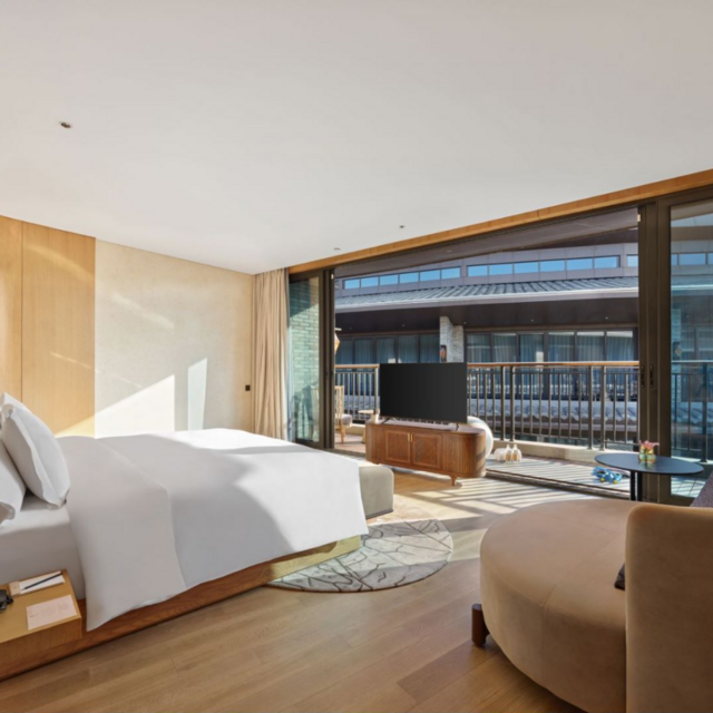 首先,所有的客房都以酒店建筑弧度来布局,均设有落地玻璃,并且都设计了阳台。阳台之外的风景,有“内外”之分,朝内,是酒店的户外景观中庭,设计拉满;朝外,则伴着田园风光。