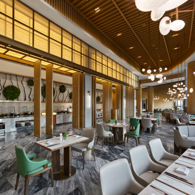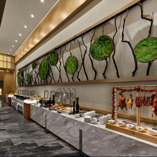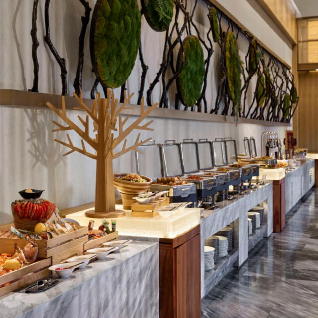 自助早餐在此享用,冷热菜都有,还有不少特色小吃。周末及节假日,餐厅还会增设自助晚餐,主题也是随季节来变化。