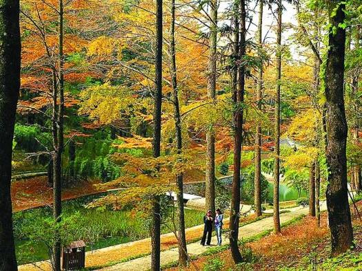 商量岗景区位于浙东四明山腹地,离江南名刹雪窦寺仅7公里,商量岗森林资源丰富,有林木13379亩,植物种类多达1000多种,老的大树树龄在千年以上,森林覆盖率达90%。林中溪水潺潺,万木竞秀,对有益处的负氧离子含量比普通城市高出1100多倍。夏季气温高不超过28度,7、8月份平均气温仅23度,是夏日避暑的胜地,被誉为浙东的香格里拉。除了夏日避暑,冬日滑雪以外,这里丰富多彩的活动项目及卓越的运动设施更是游客追求动感假日的理想场所。