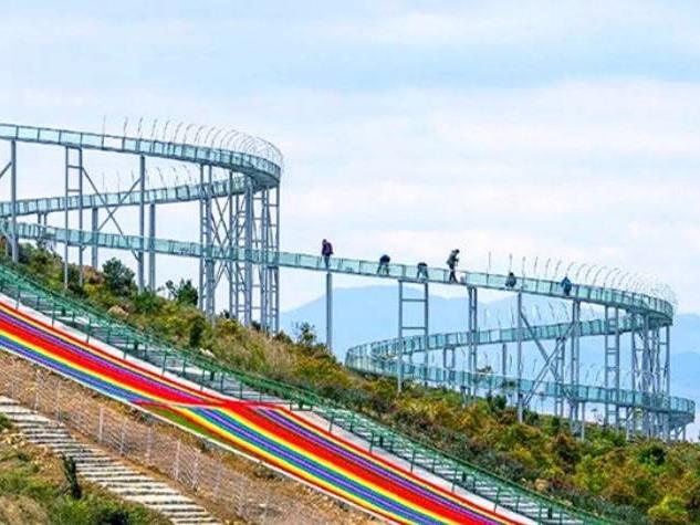 “网红”玻璃水滑道和七彩草滑滑道和“尖山头”遥相对应。人气彩虹滑道,火遍抖音的大型户外游戏,从高处速滑而下,享受重力落差带来的刺激感。滑道宛如鲜艳的彩虹,从高处倾泻而下,五彩斑斓,十分吸睛呢!