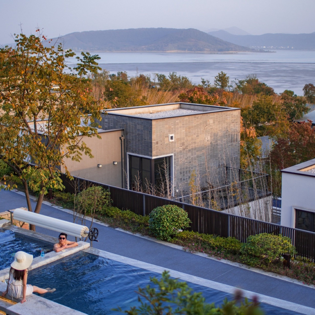 目前,度假村仅开放了一期客舍:14栋别墅,36间房,36扇窗。原木色调与自然湖景融合得毫无违和感,远近有景、处处入画。
