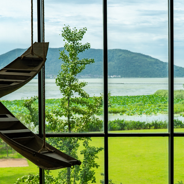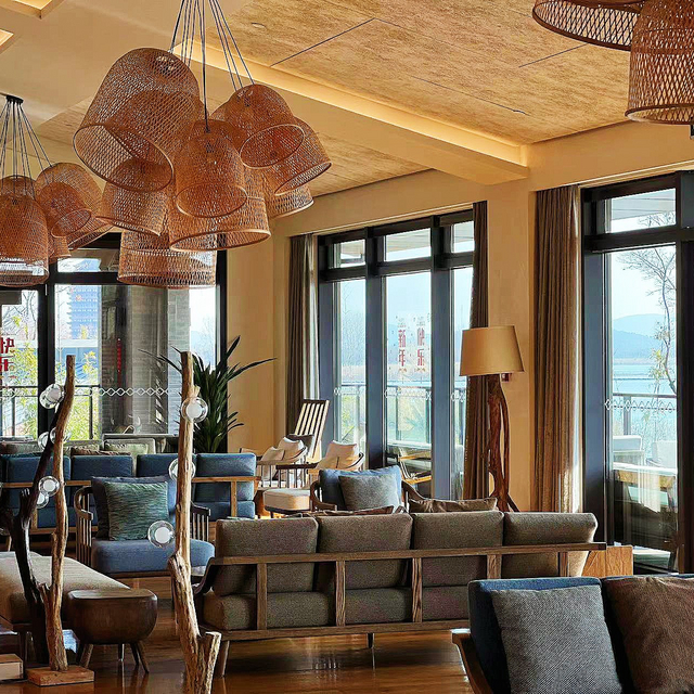 行至接待大堂,双层落地玻璃设计,将户外草坪和湖光山色引入视野。悬挂的两艘太湖船和墙面渔网装置,均从当地渔民家中搜罗而来。前台由一艘老船改造而成,旁边摆放着虾笼艺术、灯饰为浮标模样…每一处用心,都与太湖老底子故事息息相关。