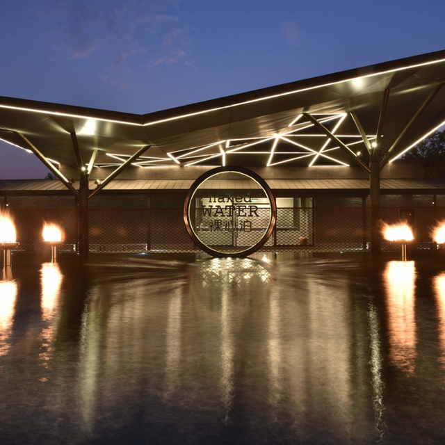 抵达裸心泊的迎宾广场,无人不惊艳,它由颇具气势的方形大水池与火柱组成。取水火交融、阴阳和谐之意,创作者希望每位到访之人,能在裸心泊拥有一段身心平衡、且可重整的之旅。同时,设计师将太湖至美瞬间:满溢的水波、如镜面般的湖面,用现代建筑语言,展现出一个既平静又充满灵动感的水面印象。