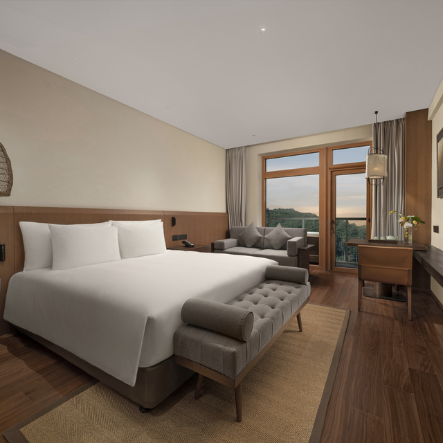 酒店一期共有112间客房,有别墅,也有主题客房。设计上流淌着开元度假村一脉相承的沉稳、简约,但又着原木的包容,外加大面积向着山野的窗景。