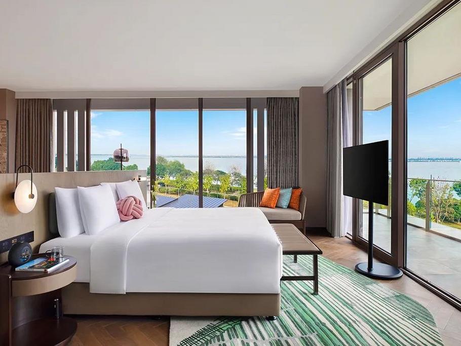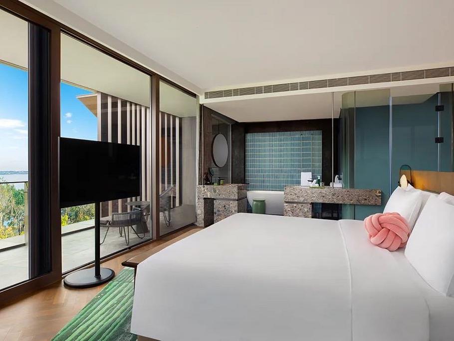 108间客房及套房,分布在1-5楼,50㎡的阔绰空间,落地窗的设计,让视野变得更开阔,每一间还配有私人阳台或庭院,大部分都可见湖光。