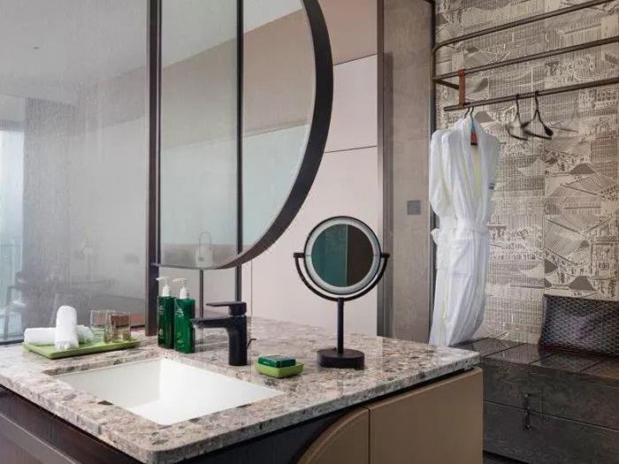 胶囊咖啡机、蓝牙音箱闹钟......干湿分离卫浴间都配有大浴缸、全套Shanghai Tang洗漱备品,带孩子入住,还可让客房工作人员送来儿童拖鞋浴袍、牙刷牙膏等。