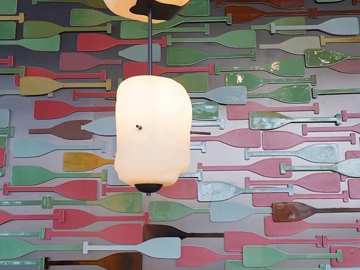 ▲接待台背后的幕墙上布满了365支五颜六色的船桨(如右图)