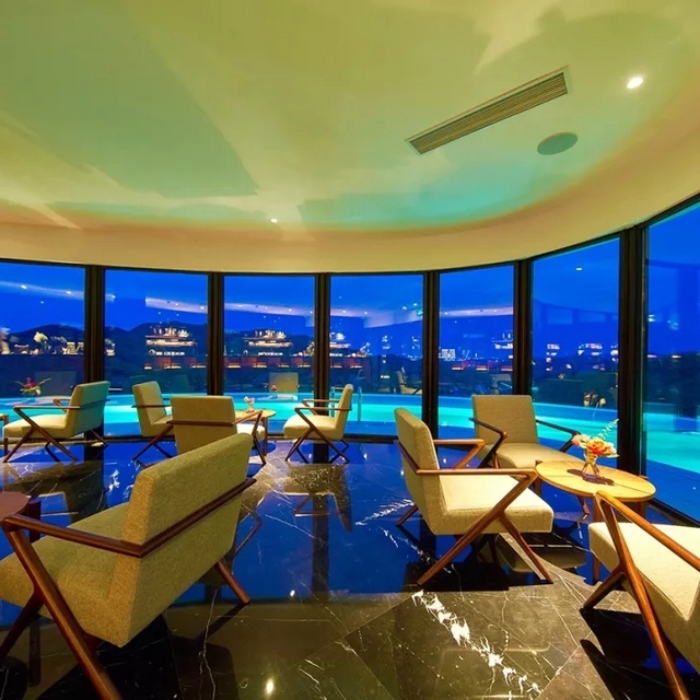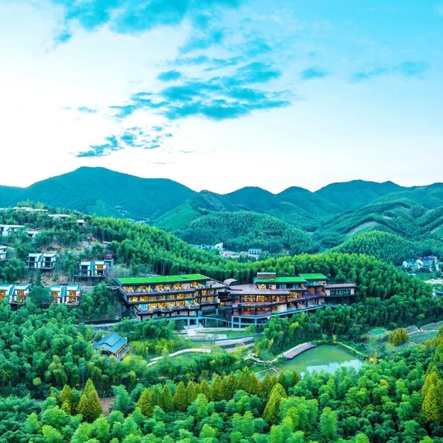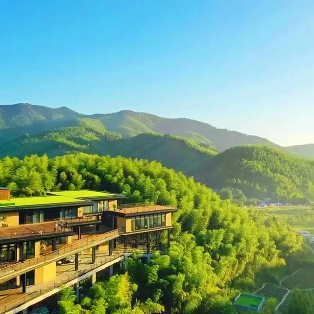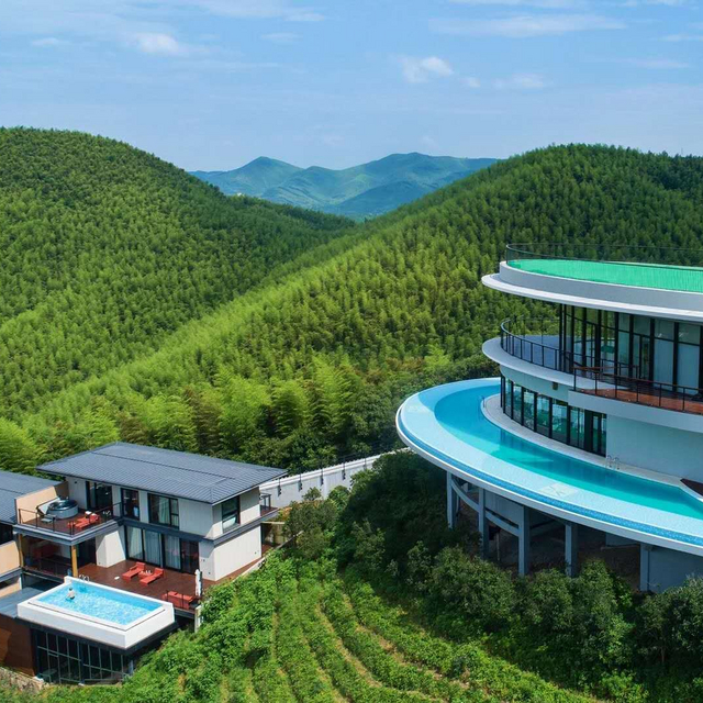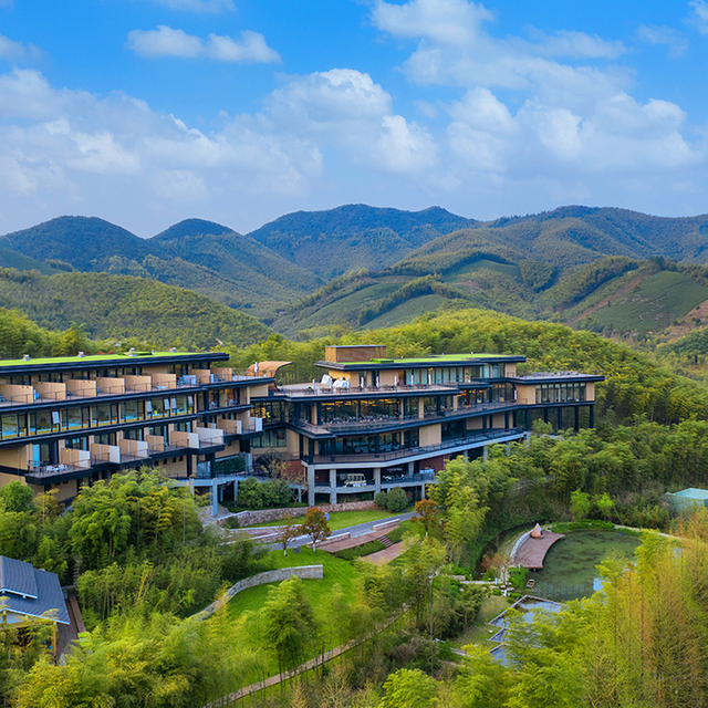 2019年4月正式开业的它,位于湖州吴兴西塞山旅游度假区,高达95%的森林覆盖率,四季都有看不尽的绿意,因此,便有了“绿奢”美誉。