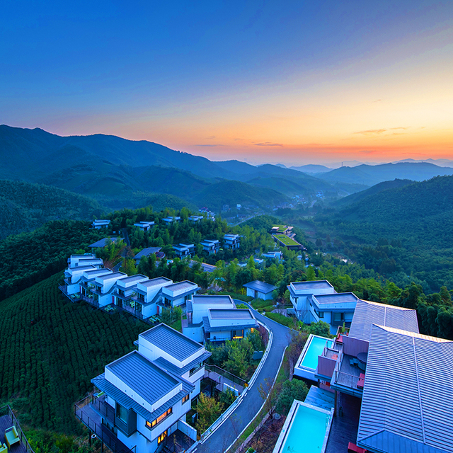 慧心谷占地约300亩,被竹海、茶园、山野层层包裹,避世安静,所有的建筑都盘踞于山中,依附山势来布局,与竹海茶园紧密相吸,丝毫不抢风头,整个度假村就像是从山谷里长出来的一样。