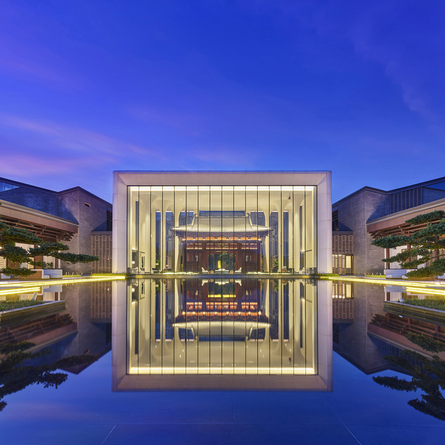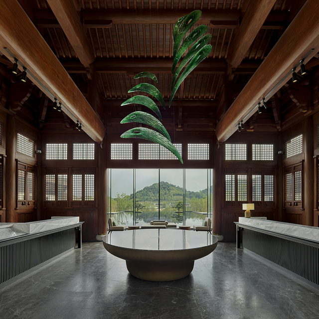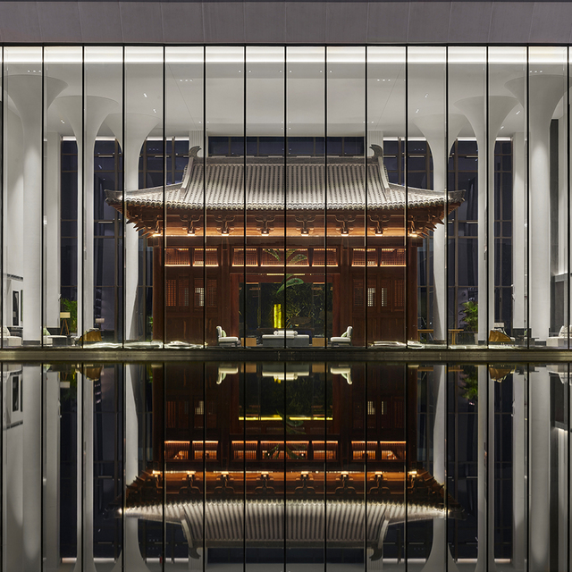 大堂尽头处,落地玻璃引入户外山水风光和自然光线,白天看景,窗框成画;晚上,看建筑与水的倒影画面,梦幻满分。