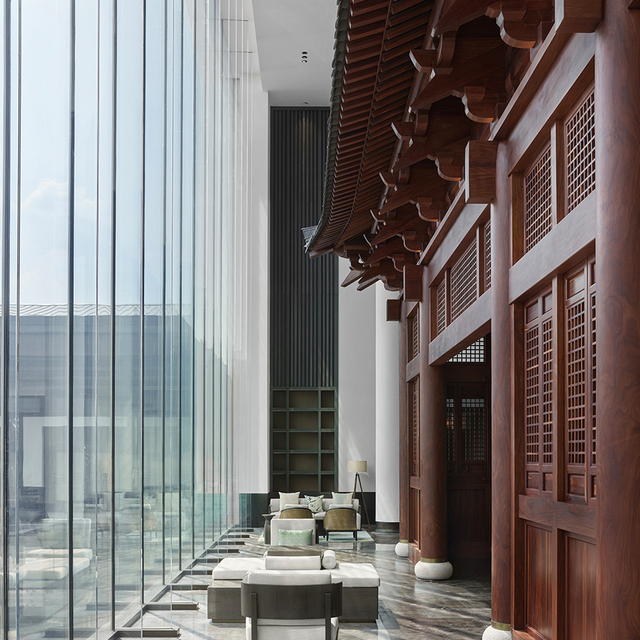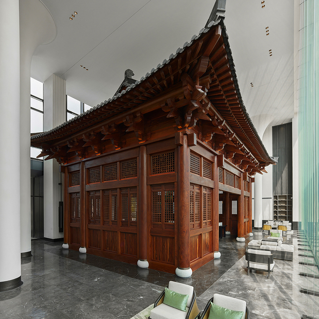 酒店将陆羽鸿渐楼(复刻而成)“搬运”至此,不仅赋予了酒店念古的穿越氛围(致敬陆羽),还增加了大堂的私密待客空间,古楼犹如盒子中的宝物,让空间有了传统与时髦的融合。