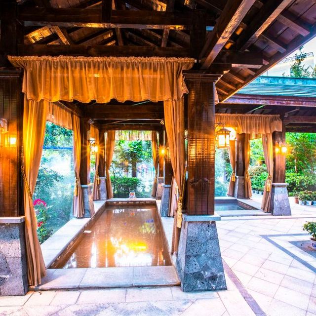 27座各具特色的温泉泡池,直取地下原汤,而且水温常年保持在42摄氏度,不随季节变化,水质细腻。室内外泡池,统统有。