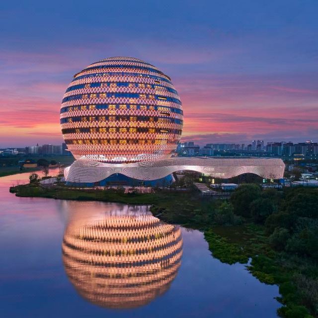 酒店地处湖州南浔明珠路18号,毗邻生态湿地沈庄漾湖畔,临水而建,水光潋滟。