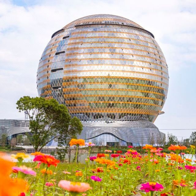 设计理念取自"旭日东升,水绕新城"之意,兼具中式水乡的古朴悠扬和新兴科技的未来感。