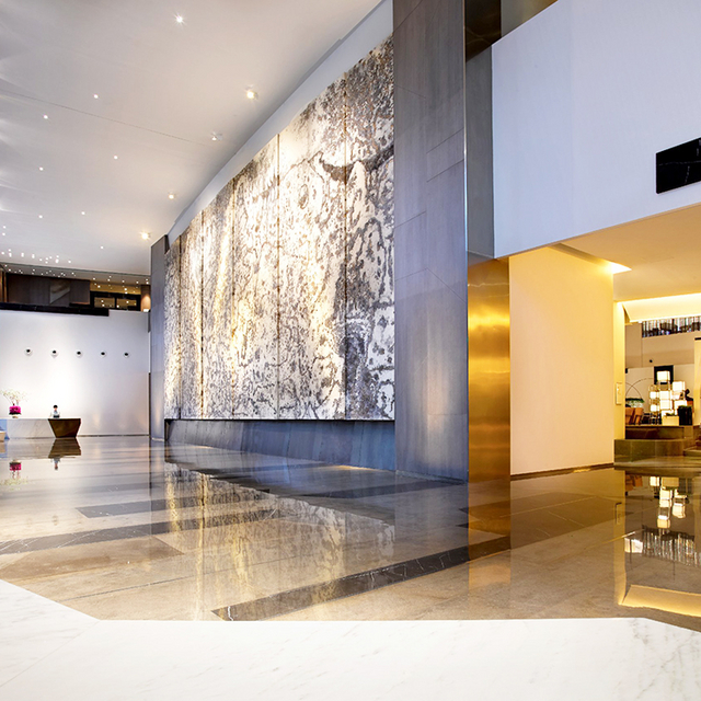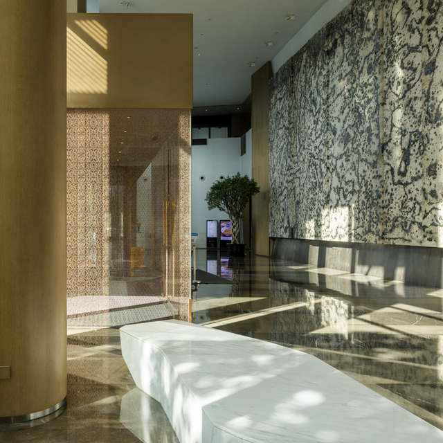 酒店室内设计以苏州园林为灵感造景,走入大堂,映入眼帘的是巨幅黑白水墨画墙,后面便是备受瞩目的酒店中庭。