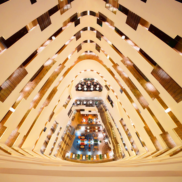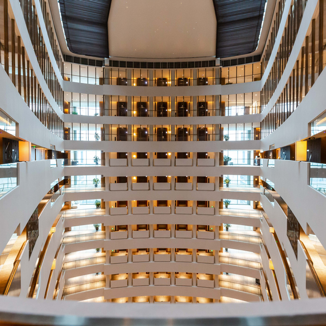 29层高的玻璃顶三角形中庭给人一种惊叹的视觉冲击,简洁大气的线条,让人忍不住拿出手机上下、左右各角度拍照。玻璃天顶,使得自然的光线从头顶射下,到了夜晚,灯光闪烁“仿佛银河”,令人叹为观止。