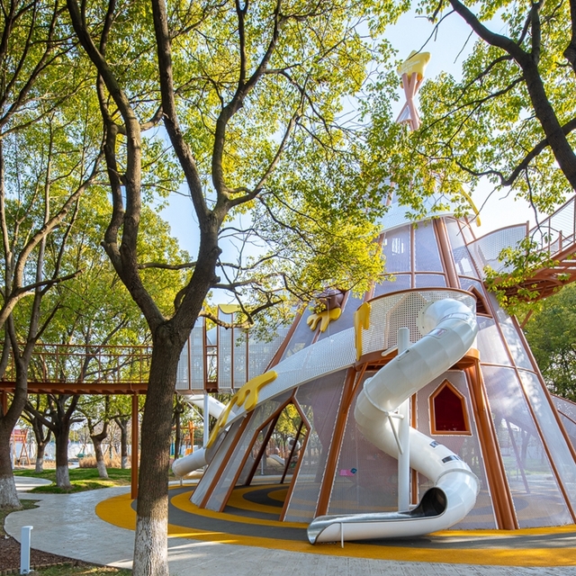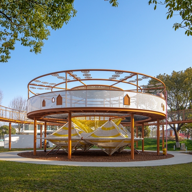 一个超大的四层户外绳网乐园,美梦浮岛、地鼠之家、松果旋风、蜜核塔…多元创意的布景和设置,光听名字就足够期待!