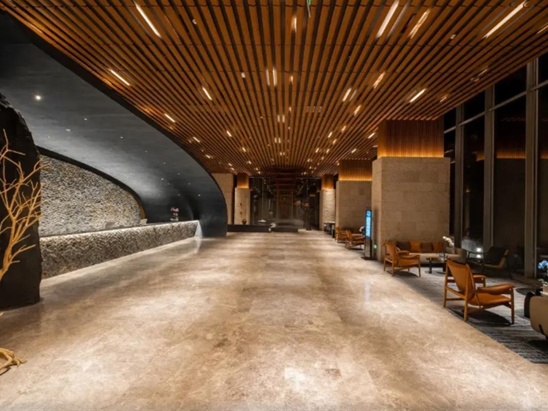 穿行于酒店各处,会发现很多巧思艺术装置,让这家芳草地的室内区也充满了惊喜发现。大堂所在位置为5楼,超大的落地窗引自然美景入室;以岩石+木材为主打元素的空间,自然氛围拉满。总之,每处曲线的起伏,都是对水文与地脉的聆听;每一丛植被的落位,皆是向原生生态的致意。