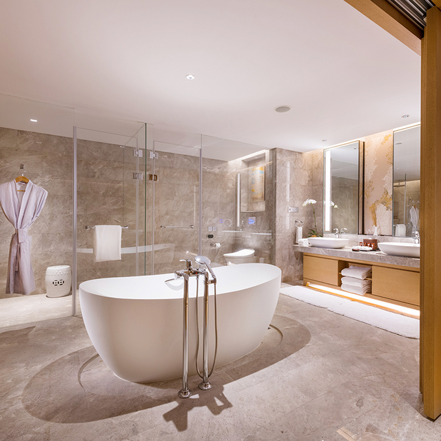 干湿分离的大理石卫浴、蛋形浴缸浴、双洗漱台、智能化妆镜、智能马桶、整套沁人心脾的百瑞德洗漱备品…