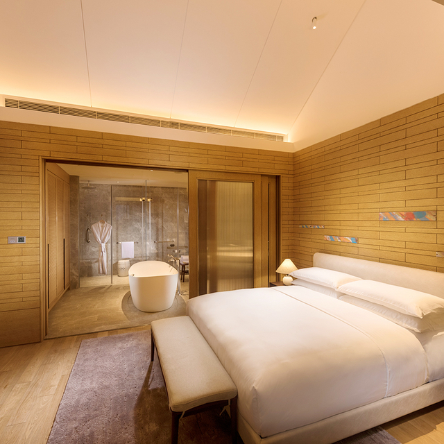 客房内设计风雅,质感满满,地板、家具等都是原木所制造,色调为温暖系,住进来就给人自然温馨之感。不管是客厅还是卧室,都有落地玻璃窗设计和全自动窗帘。