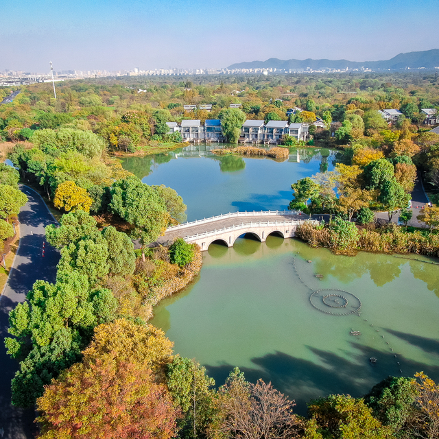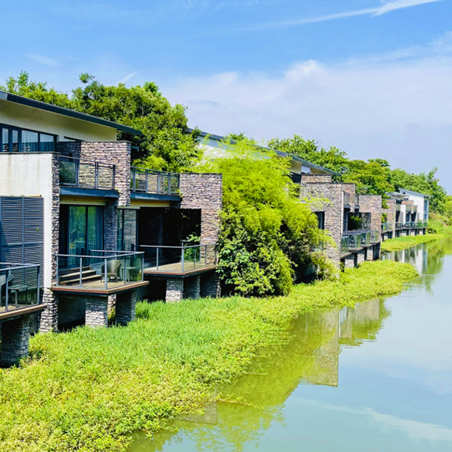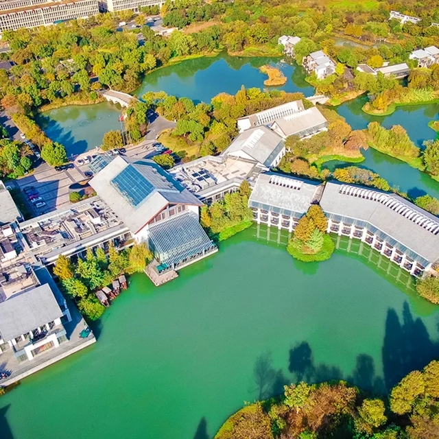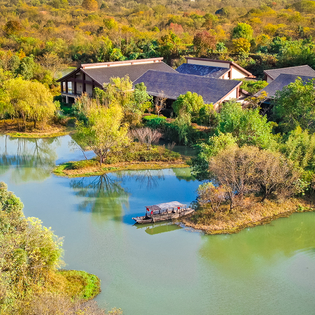 酒店楼房错落分布在林木花丛间,景观客房坐拥曲水萦绕,芦荻翩跹的视野。室内设计以简洁、幽雅、静谧融为一体,与西溪水景浑然天成。同时客房配备室内科技设施,无线网络覆盖。