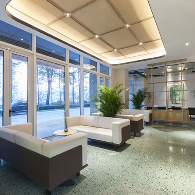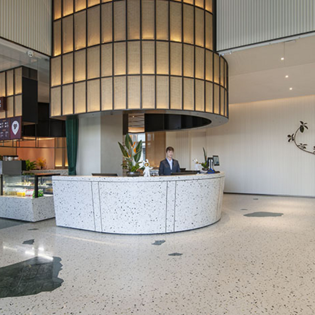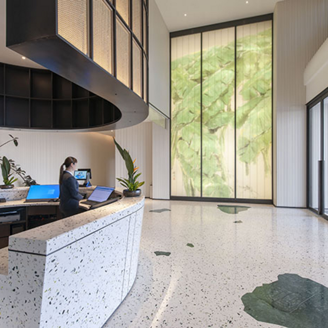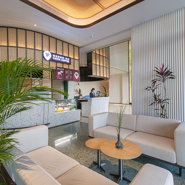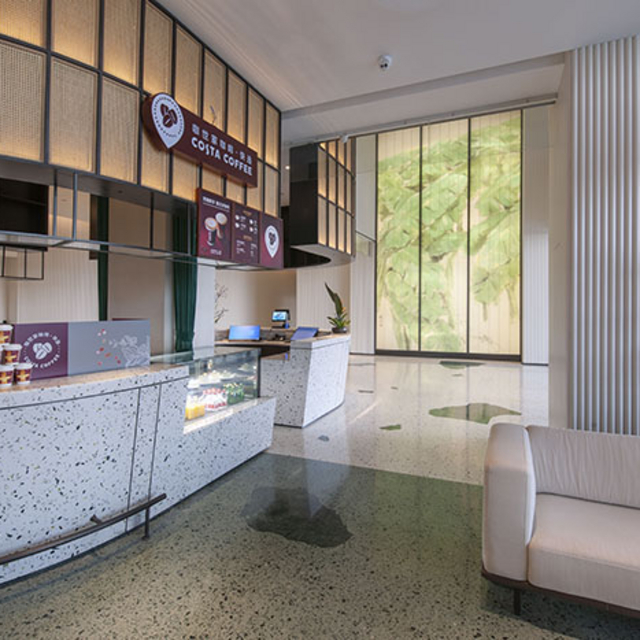 酒店整体氛围很符合当代人所需,设计传承“自然、生态”的轻东南亚风格,全幅落地窗、绿植、温馨的水磨石,配以艺术家手绘的大幅芭蕉叶玻璃幕墙,交织出一幅休闲生活的艺术画卷。