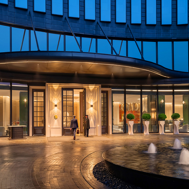府邸的尊贵之感从酒店门口便悄然开启了,环形车道、圆形水池,加之延展而出的弧形门庭,俨然像是来到了一座奢华的私家庄园。