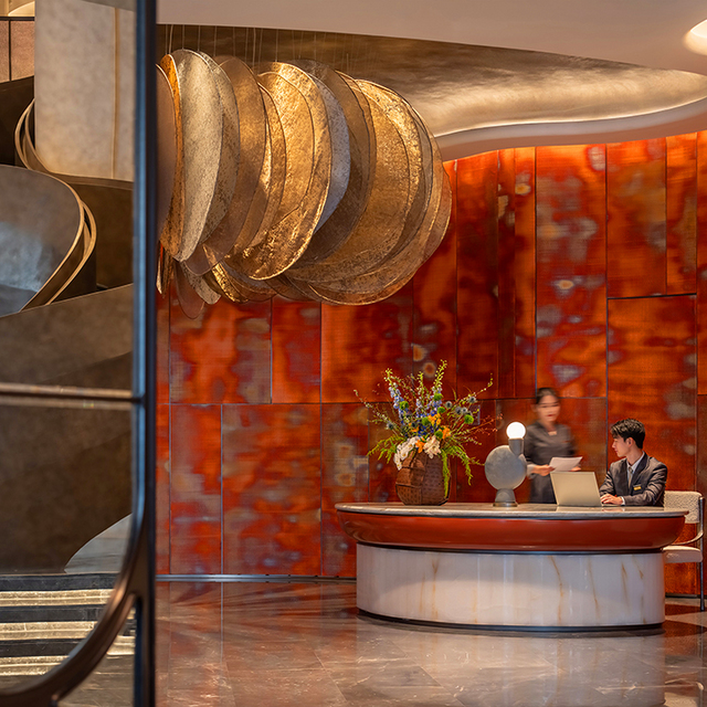 前台宛若片片西湖荷叶的金属艺术吊灯,搭配以日落时分湖面波光为灵感的背景墙,共同编织出“湖光夕照、藕荷生香”般意境的西湖画卷;