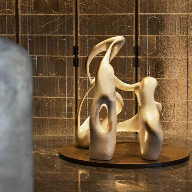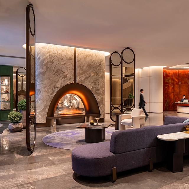 大堂设计更为精妙的是,还将功能性与艺术性完美融合。客人动线从入口蜿蜒至各个角落,移步换景间,如同游历于收藏家私人博物馆中,空间中各类展示陈设层次分明引导宾客的脚步,自然划分出接待区、休息区、展示区。