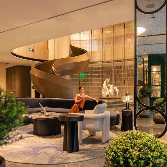 悠然踱步于大堂各处,让人好似游走在一座满载杭州历史记忆与艺术沉淀的摩登殿堂。