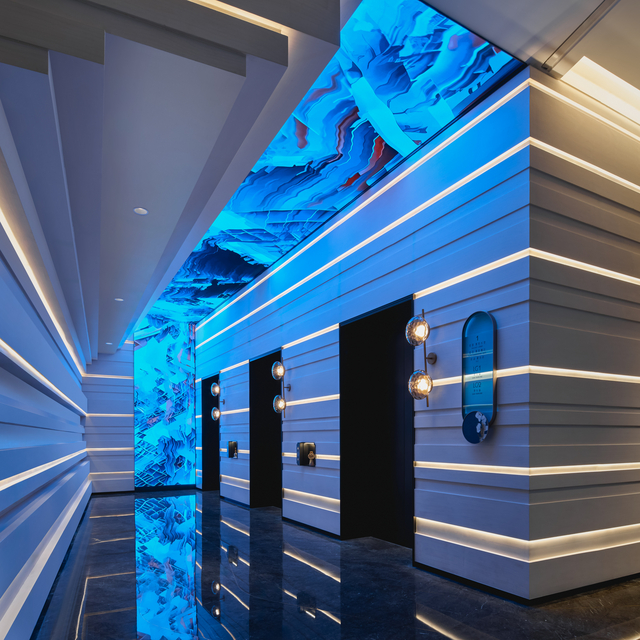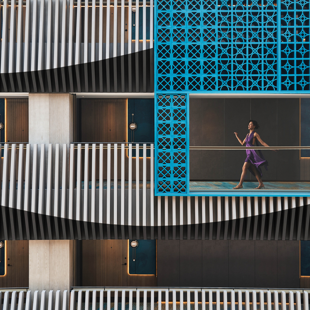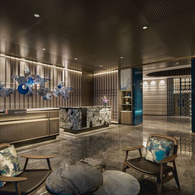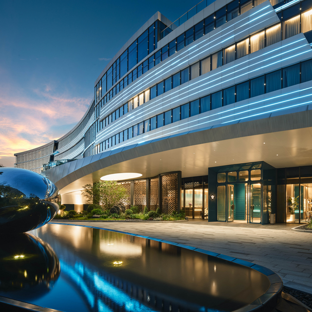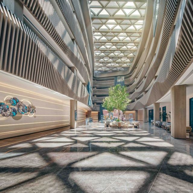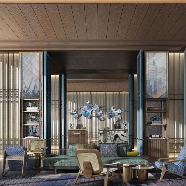 穿过苏州园林曲径通幽的内部道路,抵达一墙(以御窑金砖为灵感)之内,山水花木的落客区,继而进入苏州传统宅邸厢房式的大堂。墙上悬挂着多幅艺术画作:大堂休息区《浮城掠影》灵感来自吴门画派作品、大堂背景《城市印象•苏州》展现古今交融的苏州面貌…