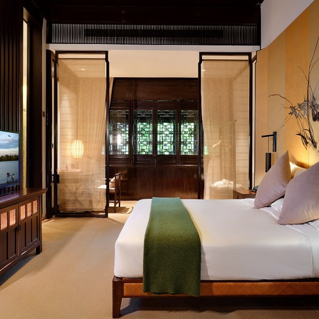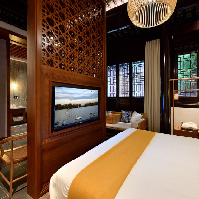 名门园景房面积约35㎡,客房里的苏式元素更为亮眼,竹编的大床背靠着落地的苏绣巨幅水墨画,床头柜、梳背椅。