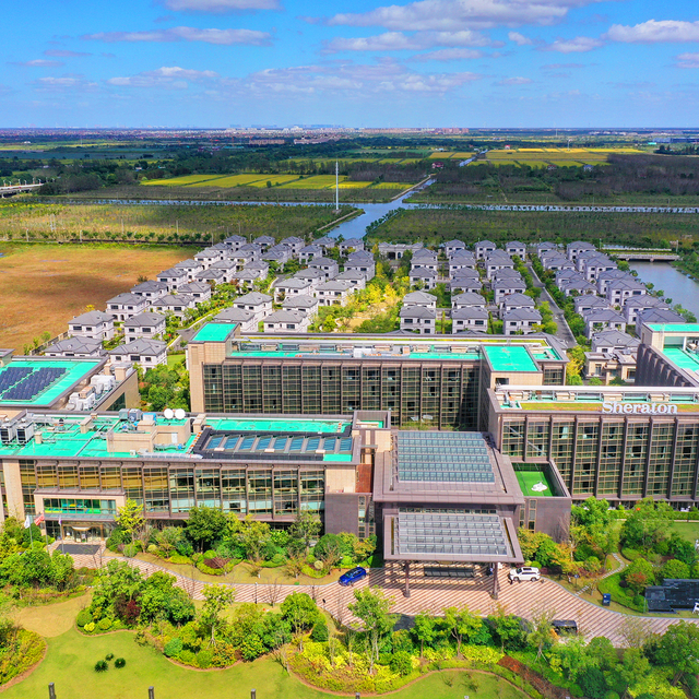崇明由由喜来登坐落于上海北部的崇明岛的东端,靠近瀛东村,过长江大桥,下G40高速,打个弯就要到酒店了。