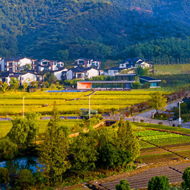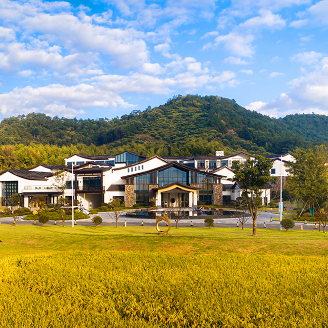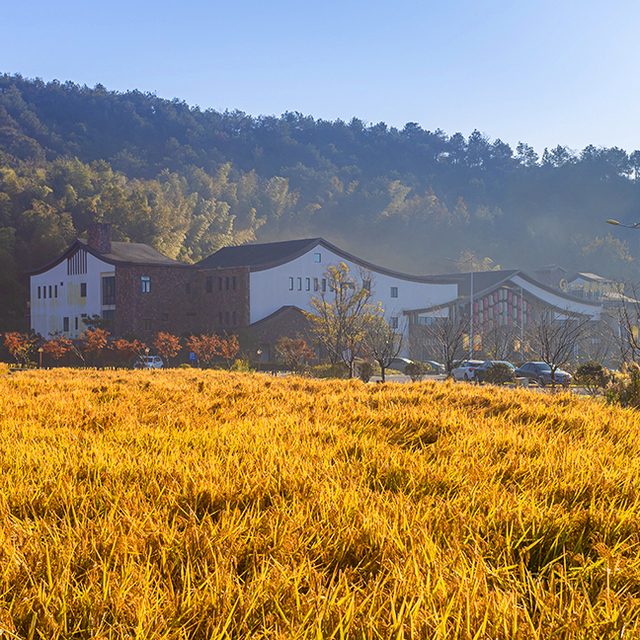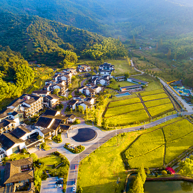 酒店就像是一座空降于此的江南村落,粉墙黛瓦的新中式建筑与远山苍翠、盎然田园融为一体,曲幽通径,鸟语花香。