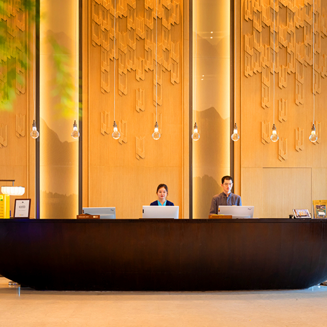 进入大堂,一眼就会被落地窗外的山石园林景致给吸引,开阔的空间+原木中式风家居+花艺灯饰,很快就能让人安静下来。进门右侧是前台,左侧是木质长梯,拍照很出片。