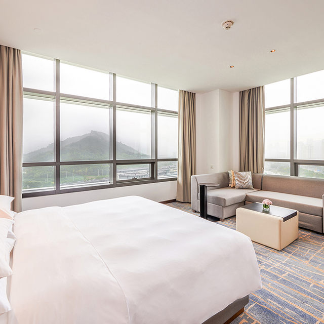 客房设计简洁明快,整体色调清新淡雅,茶几、沙发都有,宽大落地窗使得整个空间通透明亮。
